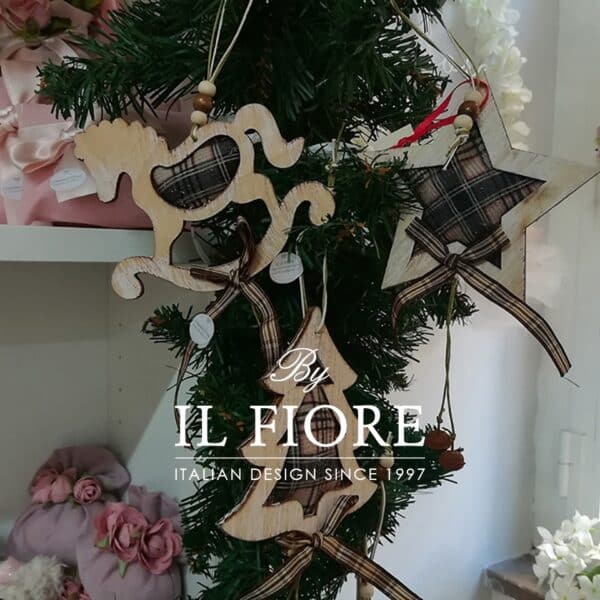 Pallina Natalizia decorazioni albero di Natale. Decorazioni in legno a forma di cavallo a dondolo, stella e albero di natale.
