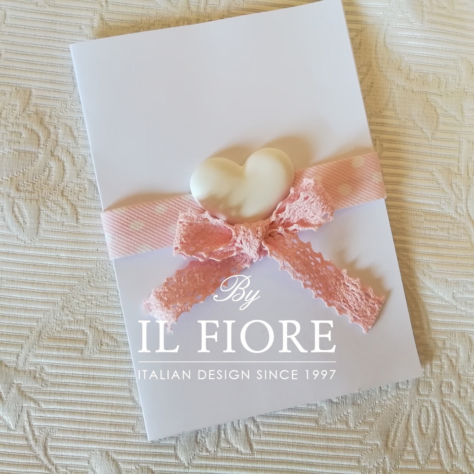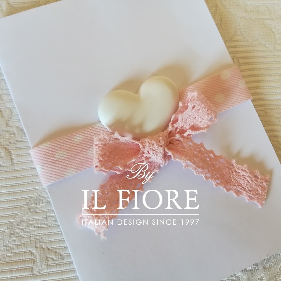 Partecipazione Battesimo bimba con cuore in gesso profumatissimo, merletto e fascia in cotone a pois rosa.