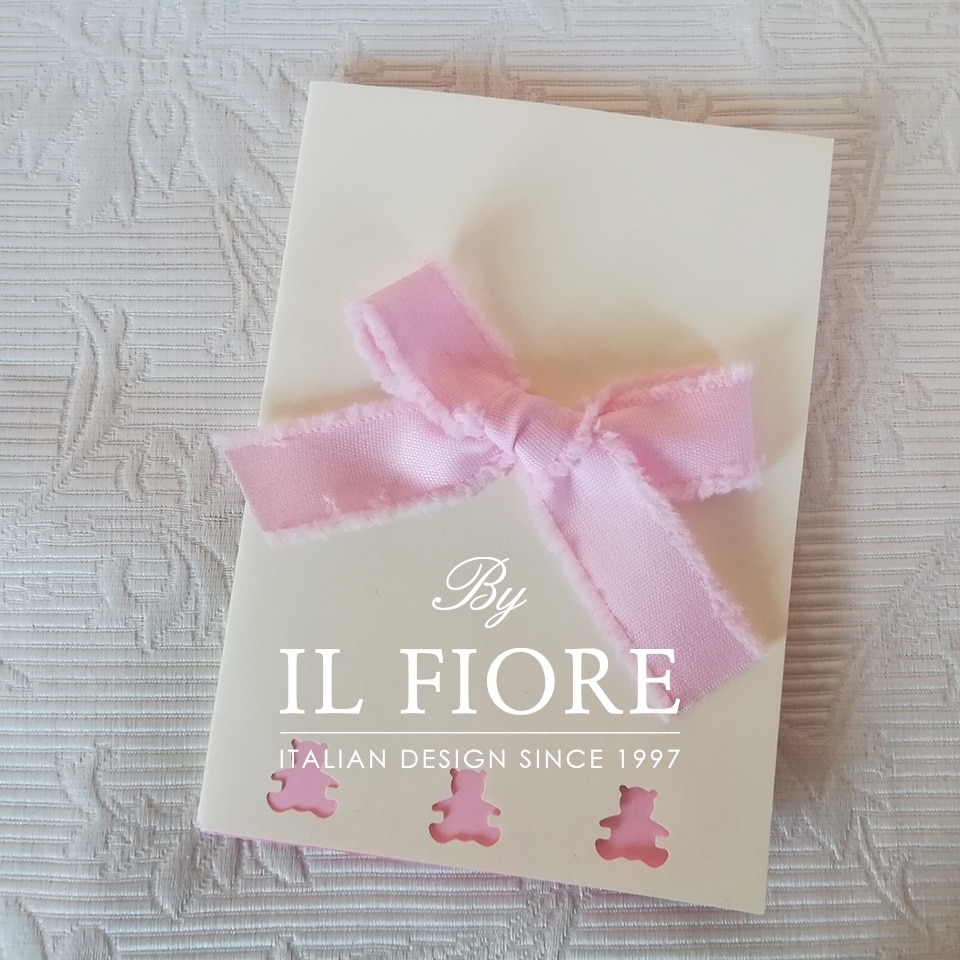 Partecipazione Battesimo bimba e bimbo intagliata con orsetti e nastro di cotone grezzo.