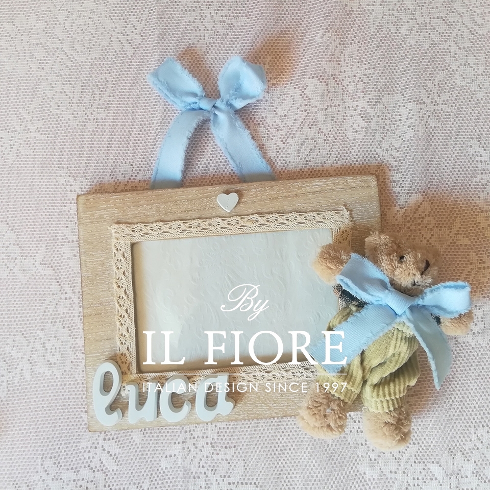 Portafoto bimbo e bimba, cornice in legno da appendere decorata con merletto e orsetto. Il portafoto si può personalizzare con nome. Ideale anche come originalissimo articolo da regalo Battesimo – nascita. Nel prezzo è inclusa la confezione regalo.