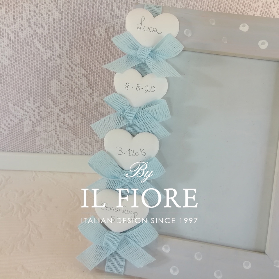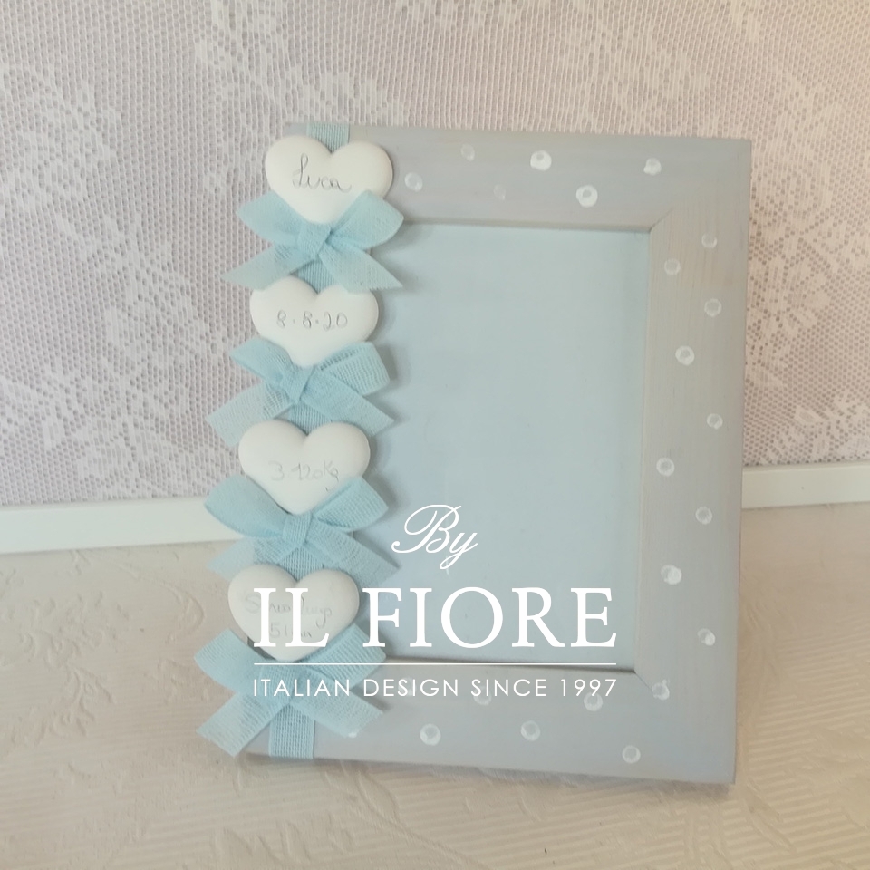 Portafoto bimba e bimbo, cornice in legno da appoggio decorata con cuori in gesso profumato personalizzata con nome, data di nascita, peso e lunghezza del bebè, dipinta a mano. Il portafoto è realizzabile in rosa e celeste. Ideale anche come originalissimo articolo da regalo Battesimo – nascita. Nel prezzo è inclusa la confezione regalo.
