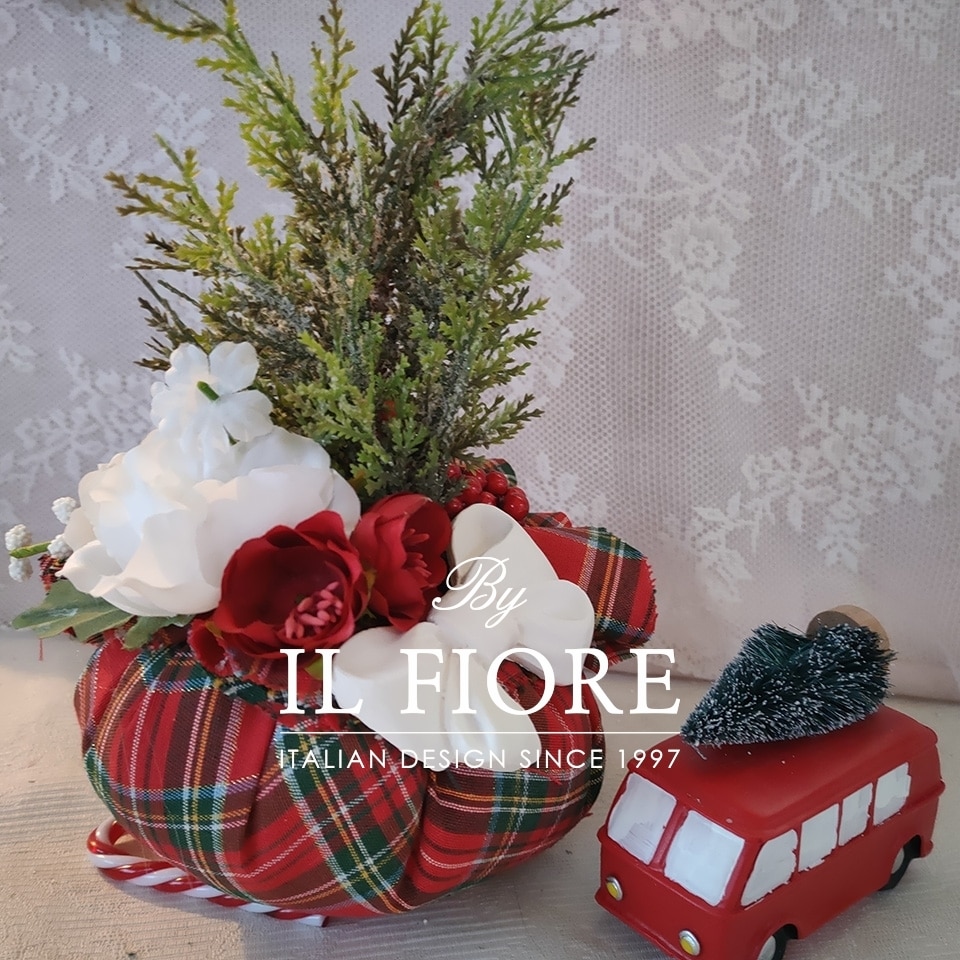 Puffo natalizio interamente fatta mano con alberello, fiori e fiocco in gesso profumato. Splendido ed originale regalo di Natale o centrotavola fatto con il cuore.