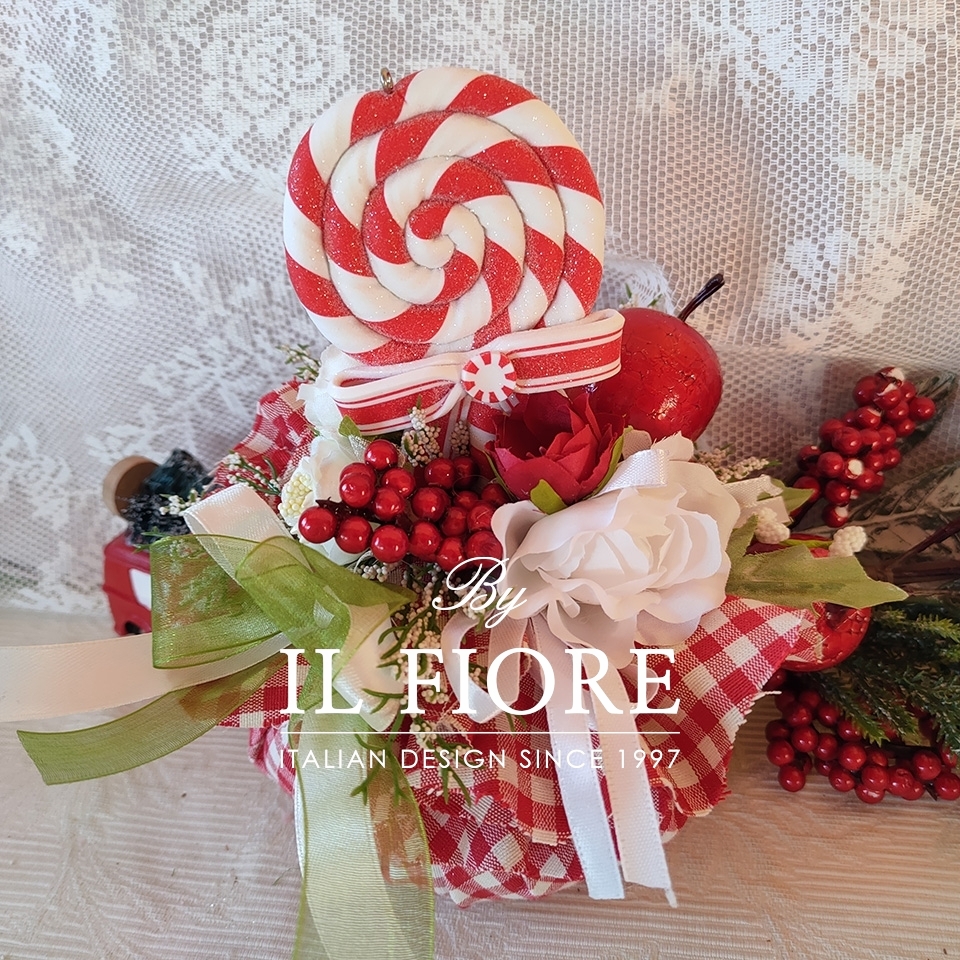 Puffo natalizio a quadri rosso e bianco interamente fatta mano con fiori e caramella. Splendido ed originale regalo di Natale fatto con il cuore.