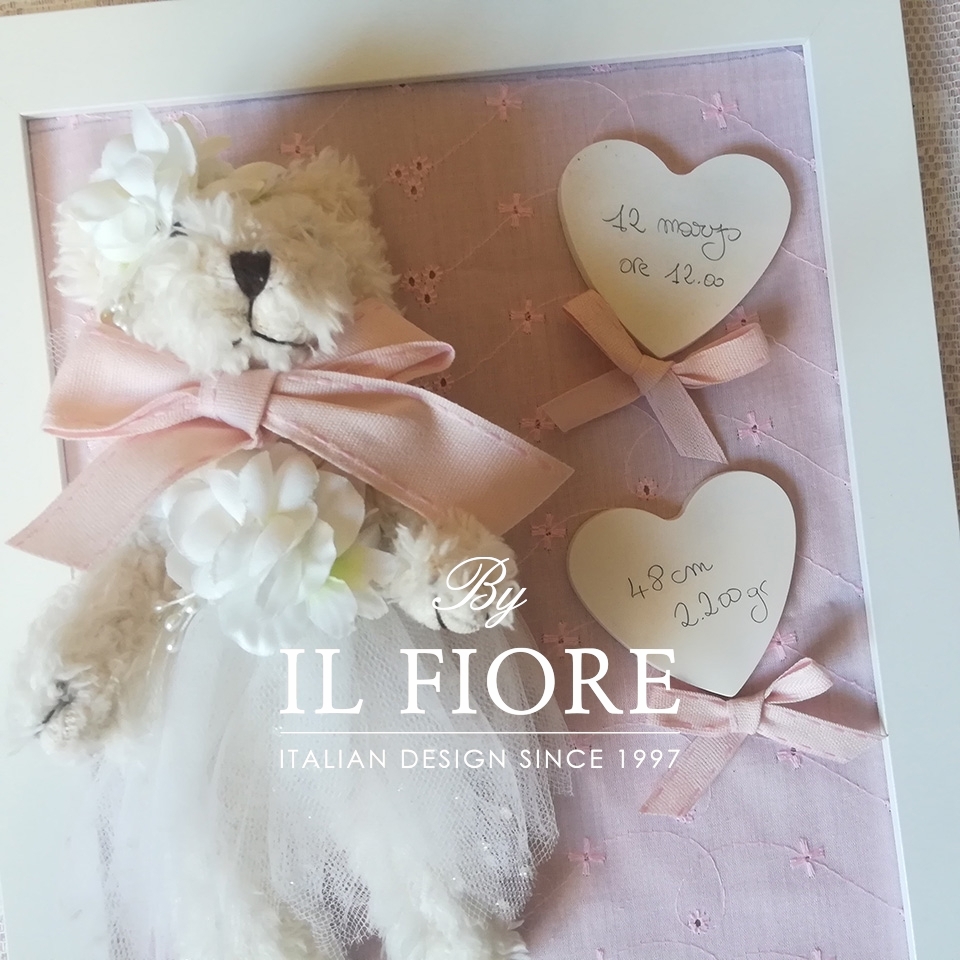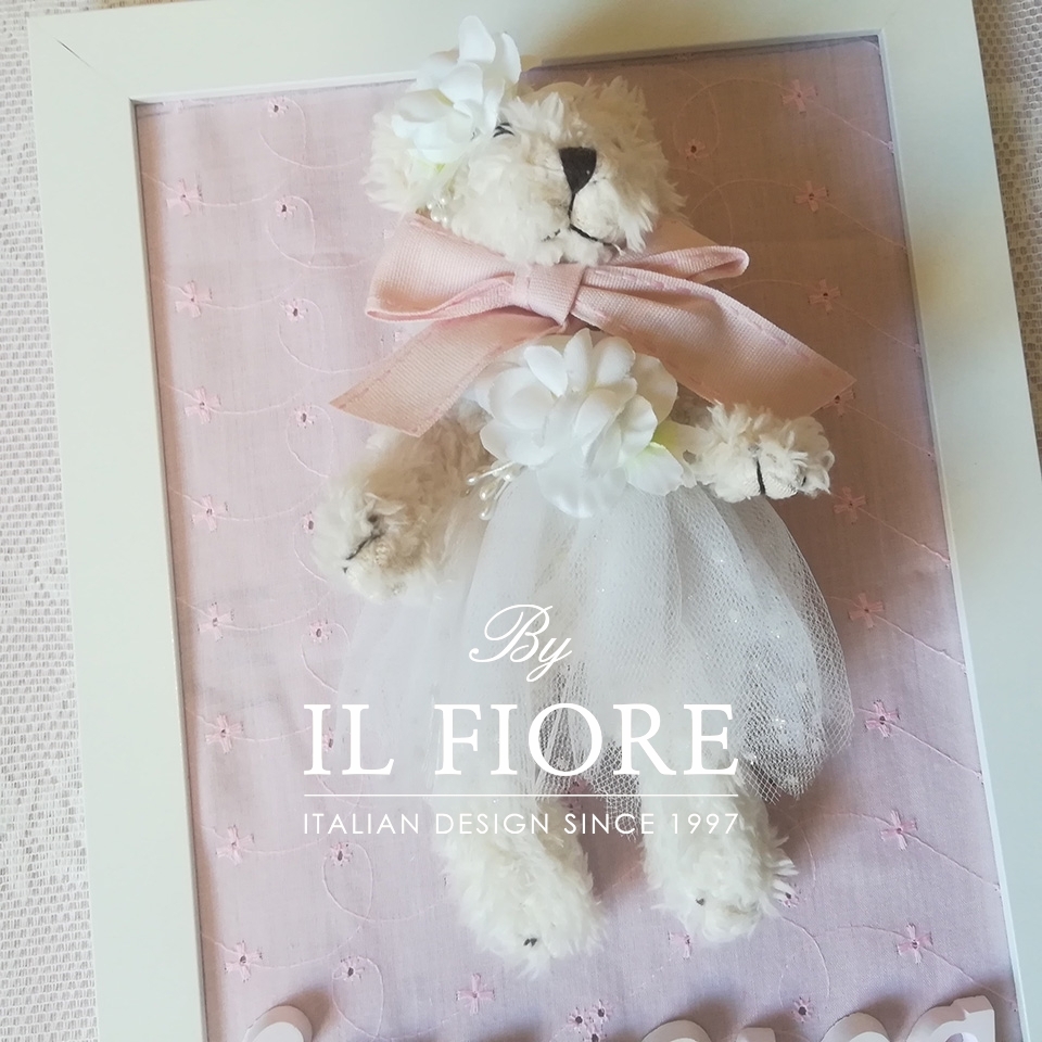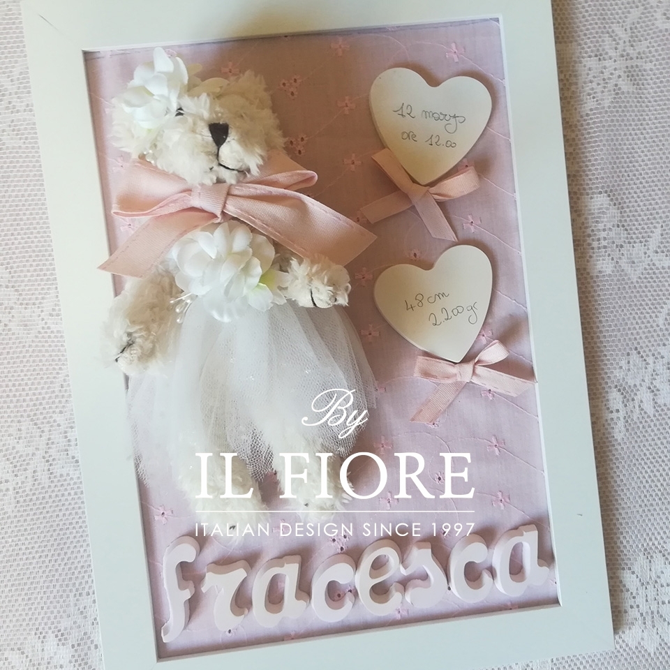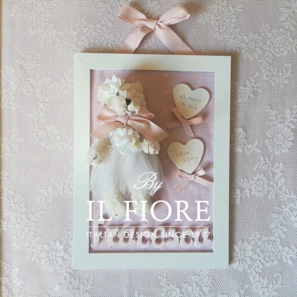 Quadretto nascita bimba, orsetto principessa personalizzabile con gessetti profumati con nome, data di nascita, peso, lunghezza e ora. Misura cornice cm 33 x 24.