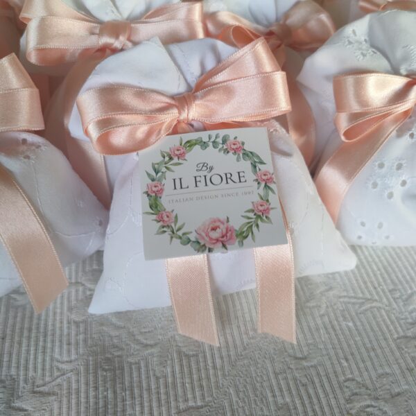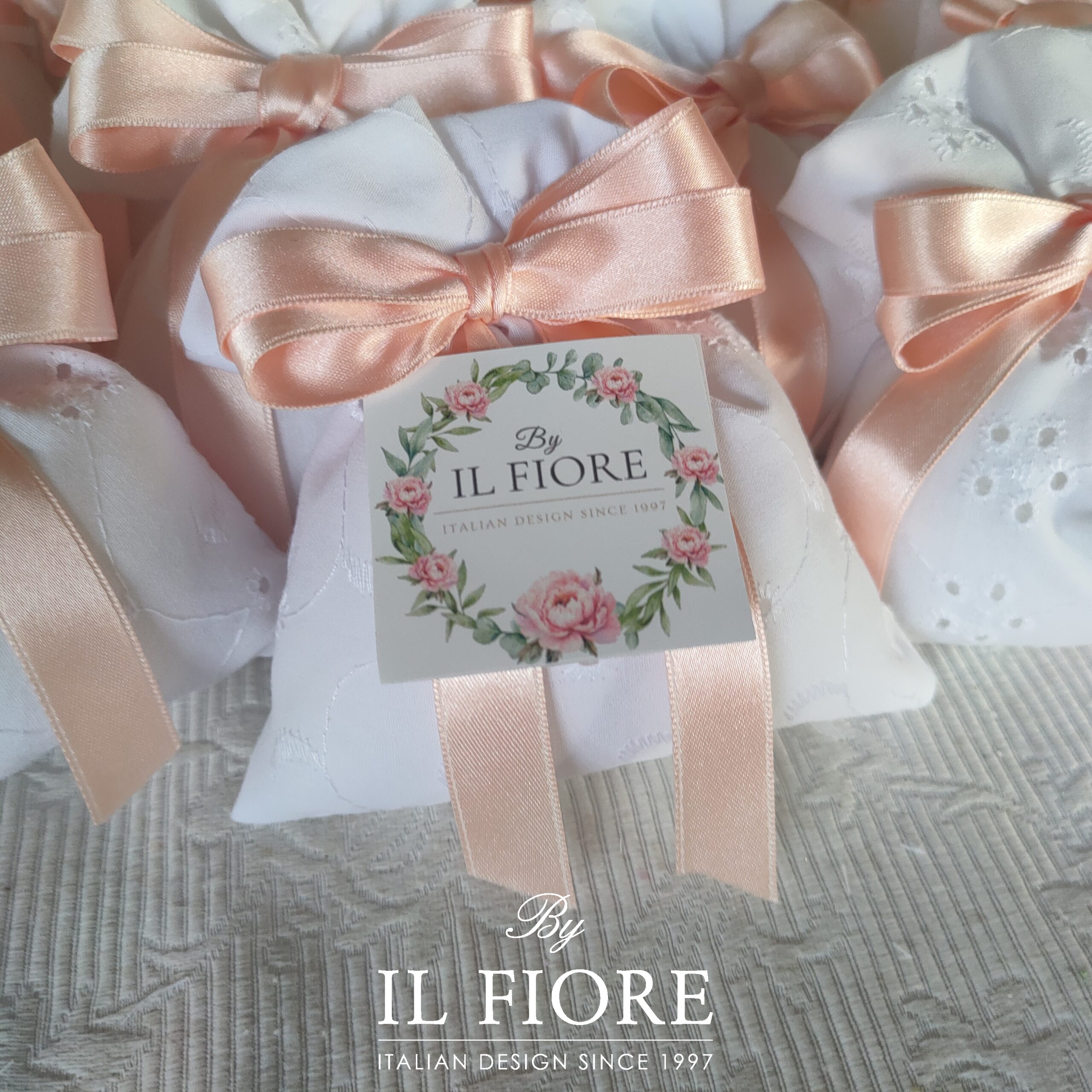 Bomboniera Matrimonio Comunione, Cresima e anniversario di matrimonio. Bomboniera sacchetto in Sab Gallo decorata con tag personalizzabile con nome.