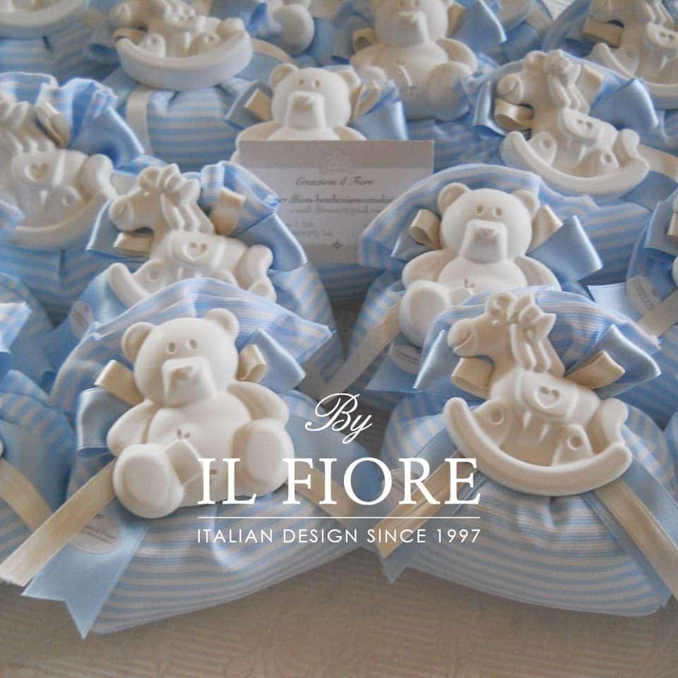 Bomboniera per battesimo sacchetto classico in piquet , decorati con fiocchetti a tinta unita rosa o celeste, misura 14×14 con gessetti profumati soggetto cavalluccio, orso e nastro di raso. Disponibile anche con sacchetto rosa e nastro rosa per bambina.