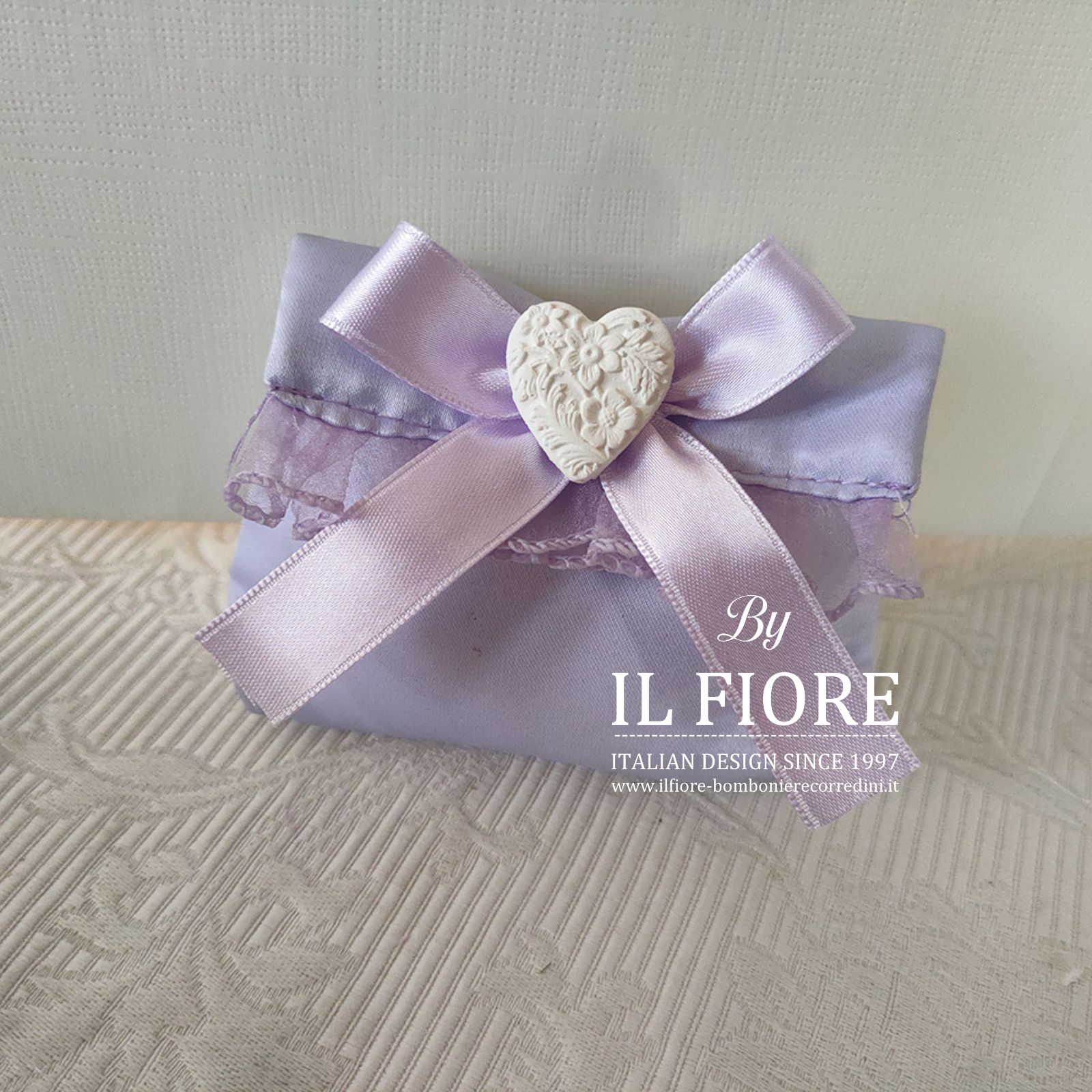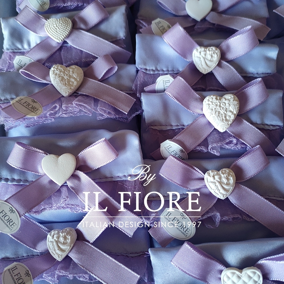 Bomboniera Matrimonio, Comunione, Cresima e anniversario matrimonio, sacchetto portaconfetti provenzale con set gessetti a forma di cuore e nastri di raso di colore glicine.