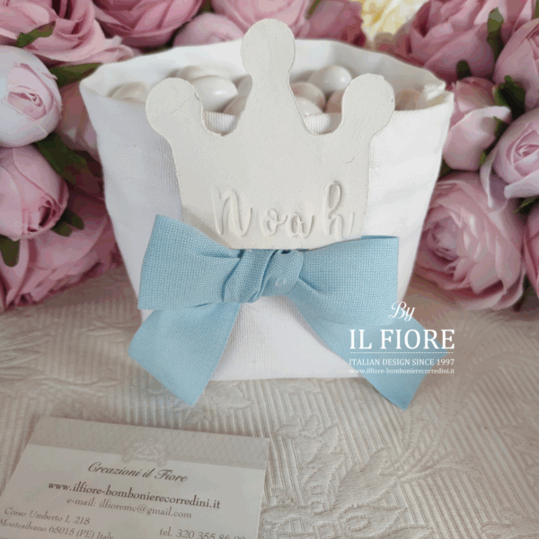 Il dettaglio distintivo e dolcissimo è la decorazione a forma di coroncina personalizzata con il nome del bebè. Ideale per il tavolo della confettata.