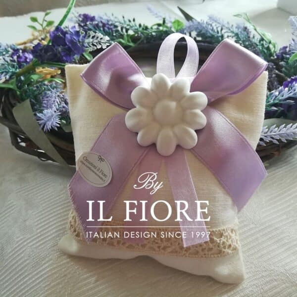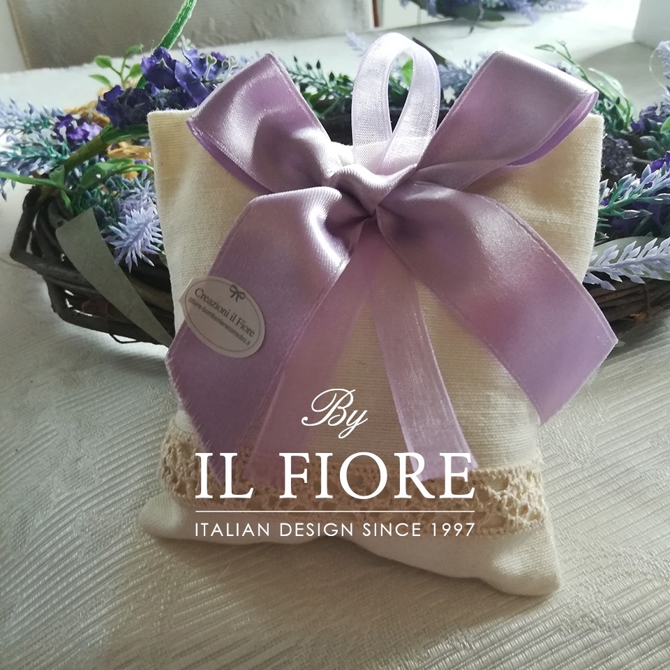 Bomboniera Matrimonio, Comunione, Cresima e anniversario matrimonio, sacchetto portaconfetti provenzale con gessetti profumati in cotone decorata con nastro in organza set di gessetti in quattro modelli, merletto e fiocco in raso, misura cm 10×10.