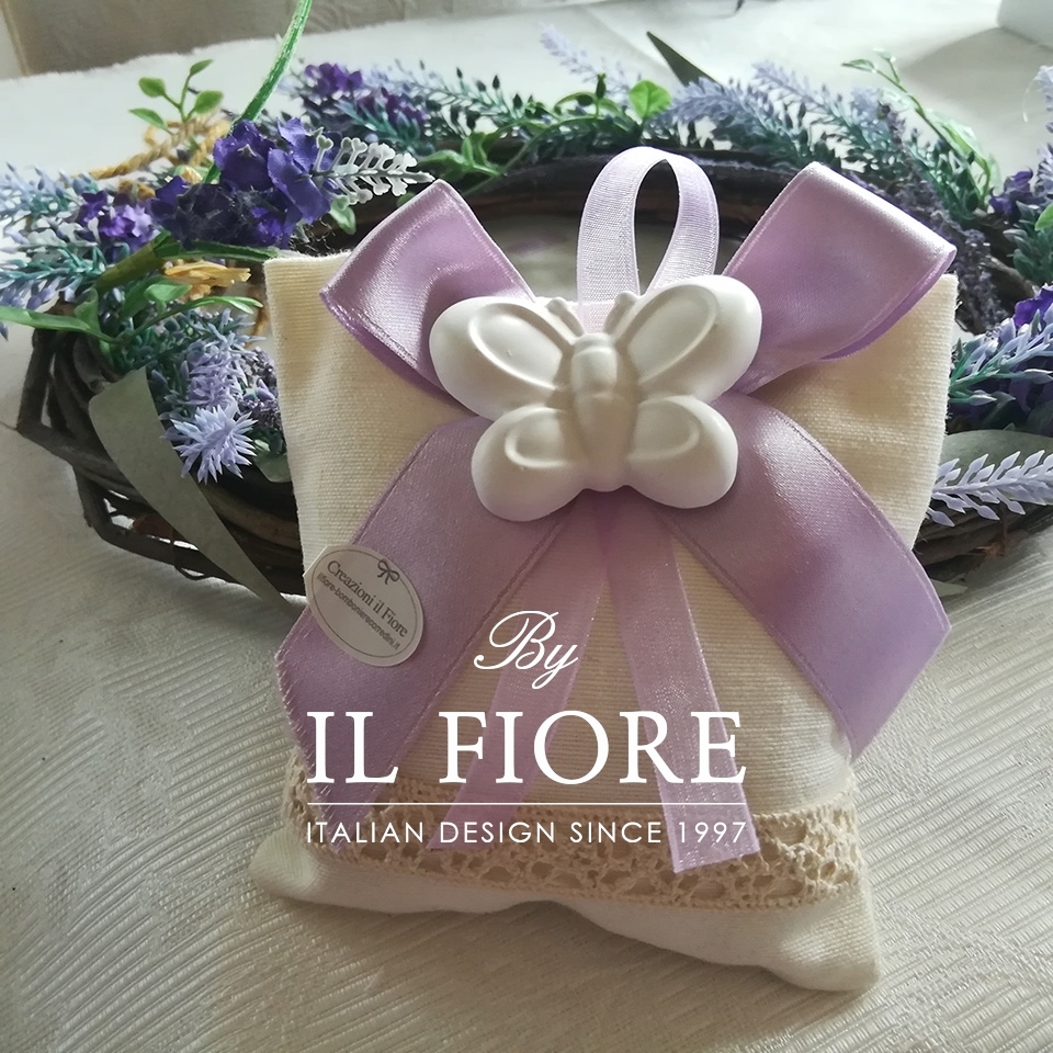 Sacchetto portaconfetti provenzale con merletto e gessetto per Comunione Cresima e matrimonio