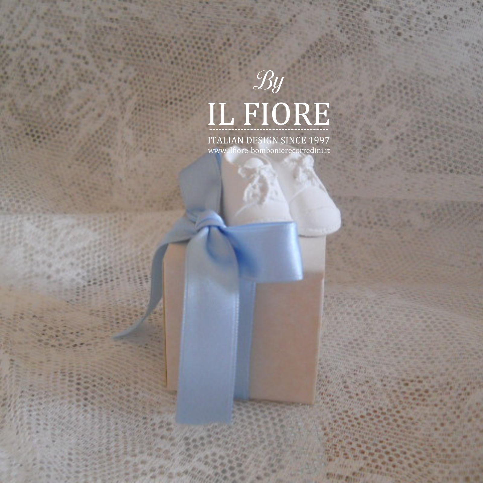 Bomboniera Battesimo bimbo scatola portaconfetti con nastro di raso e scarpette.