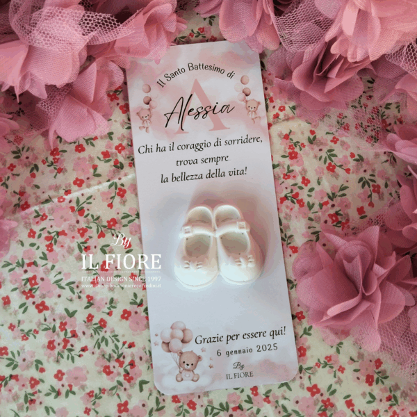 Segnaposti Battesimo bimba con scarpette e cartoncino.