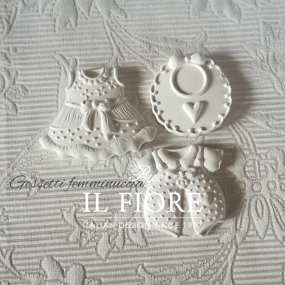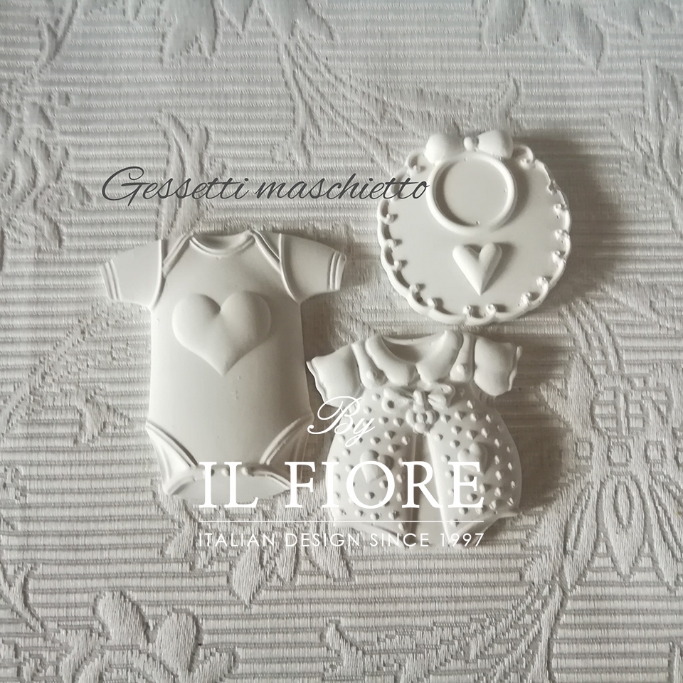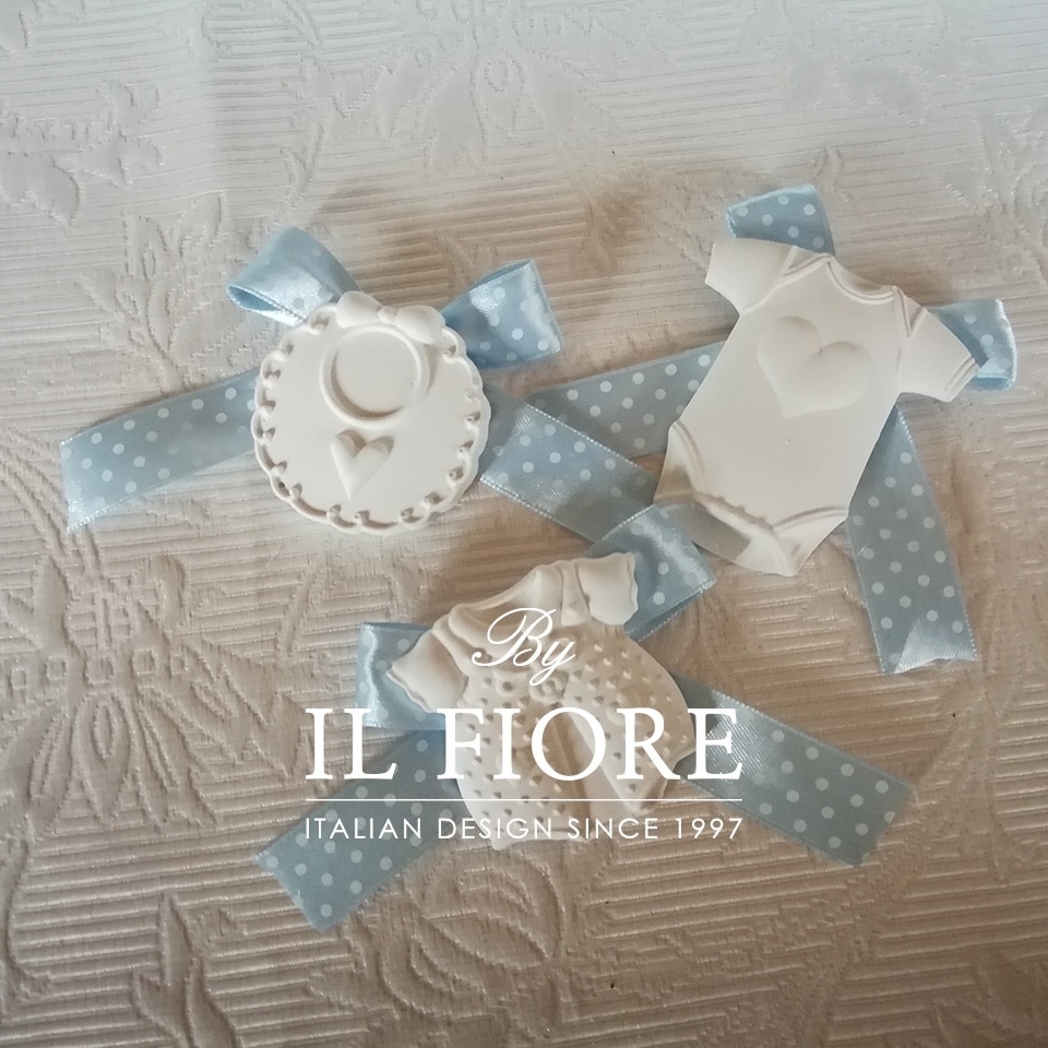 Segnaposto Battesimo bimba e bimbo con gessetto profumato a forma di body e bavaglino, con nastro di raso colore rosa o celeste.