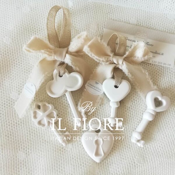 Preziosi gessetti profumati che si trasformano in segnaposto per il tuo evento. Set di 5 gessetti profumati a forma di Chiavi e lucchetto. Completano il segnaposto fiocco in raso e tessuto.