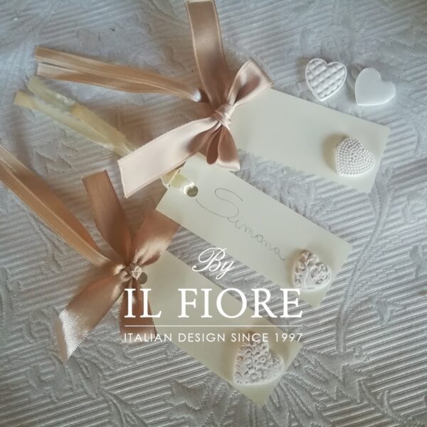 Segnaposto per matrimonio, Comunione, Cresima e anniversario matrimonio con gessetto profumato a forma di cuore formato da set di 5 modelli, cartoncino e nastro di raso color tortora. Il colore del nastrino di può cambiare.