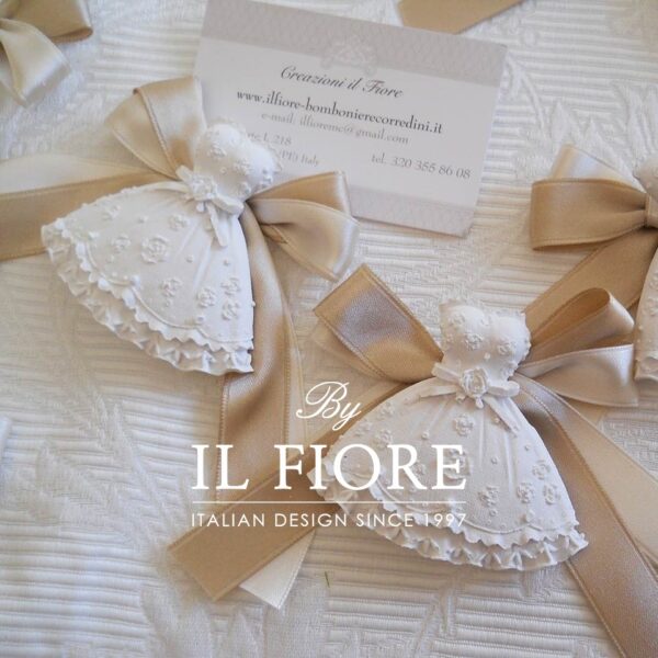 Segnaposto con doppio fiocco in raso color avorio e tortora (personalizzabili) e delizio abito romantico in gessetto profumato.