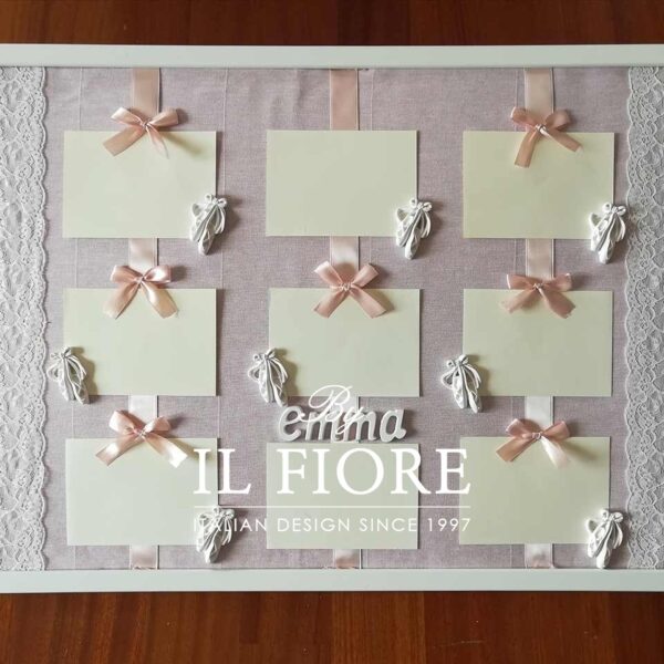 Tableau Comunione, Cresima è realizzato con tessuto in cotone e pizzo, decorato con scarpette mezze punte in gesso e fiocchi in raso rosa cipria.