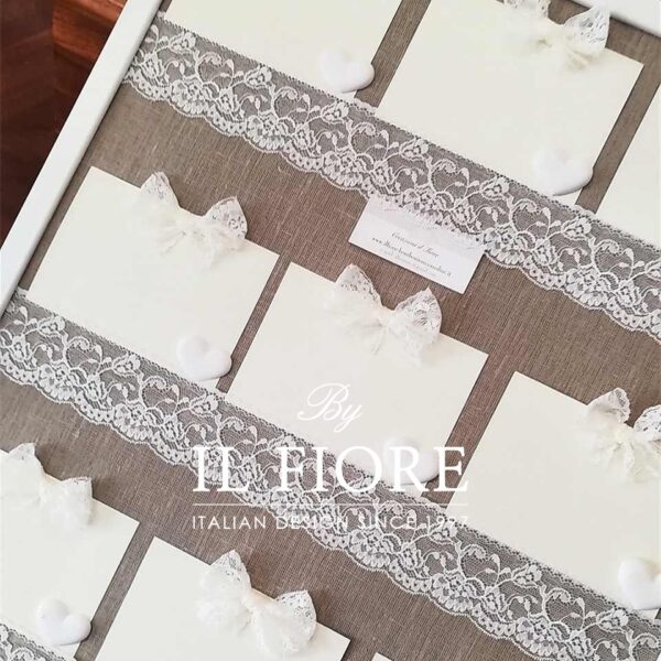 Tableau de Mariage per matrimonio, Comunione, Cresima e anniversario di matrimonio è realizzato con tessuto in lino, pizzo e cuori in gesso profumatissimi.