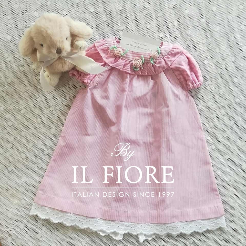 Vestito bimba a righe rosa realizzato in cotone, con maniche a sbuffo in vichy. Il vestitino ha il collo  decorato con fiori applicati e realizzati a mano. Il vestito bimba è impreziosito con pizzo San Gallo. Abito ideale per una piccola principessa! è realizzato con ottimi materiali tutti Made in Italy. L’abito è chiuso sul retro con bottoni e asole. Taglia unica 9 MESI. Prezzo scontato da € 26,00 a € 18,00. Ultimo pezzo.