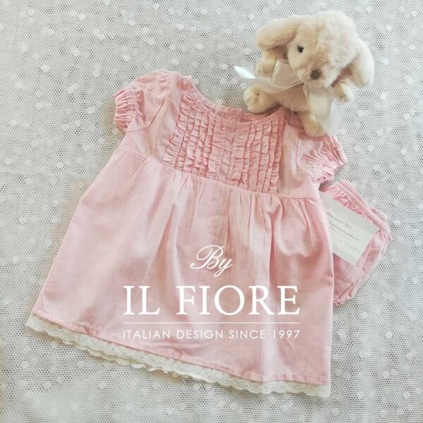 Abitino bimba per Battesimo semplice e dalla linea essenziale. Il vestitino bimba è realizzato in lino e viscosa, la parte di sopra è arricciata, la parte di sotto è arricchita con un delicatissimo merletto e munito di coulotte. Il vestito bimba per Battesimo o cerimonia è chiuso nel dietro con bottoni ed asole. Made in Italy.