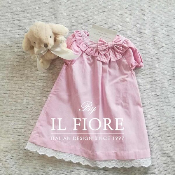 Vestito bimba a righe rosa realizzato in cotone, con maniche a sbuffo in vichy. Il vestitino ha il collo decorato con fiocco in cotone. Il vestito bimba è impreziosito con pizzo San Gallo. Abito ideale per una piccola principessa! è realizzato con ottimi materiali tutti Made in Italy. L’abito è chiuso sul retro con bottoni e asole. Taglia unica 9 MESI. Prezzo scontato da € 26,00 a € 18,00. Ultimo pezzo.