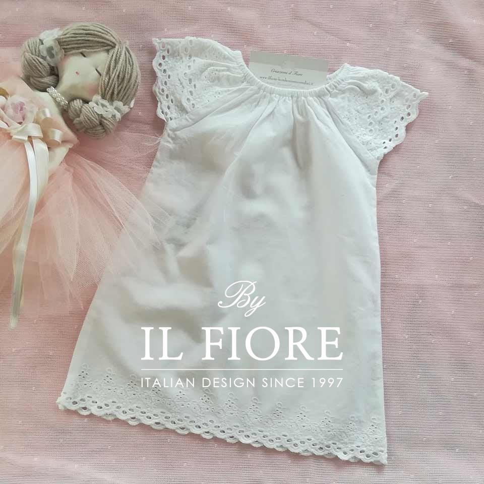 Delizioso vestito bimba in cotone.  Maniche con dettaglio pizzo San Gallo sulle spalle. Design dal taglio romantico ideale per tutte le occasioni speciali.Taglia unica 6/9 mesi. Prezzo scontato da € 38,00 a € 19,00. Ultimi 2 pezzi. Tutto made in Italy.