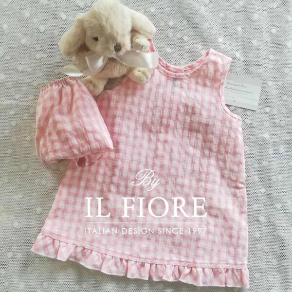 Abito bimba a quadri rosa realizzato in cotone 85% e poliestero 15%, munito di coulotte. Il vestitino bimba è realizzato con ottimi materiali  tutti Made in Italy. L’abito è chiuso sul retro con bottoni e asole. Il vestito bimba e ideale per un look raffinato. Taglia unica 6/9 MESI. Prezzo scontato da € 29,00 a € 18,00. Ultimi due pezzi.