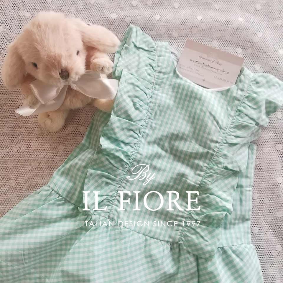 Abitino bimba di colore bianco a quadri verde con corpetto con volant e gonna realizzato in cotone, tutto foderato in puro cotone. L’abito si chiude dietro con bottoni e asole. Il vestito bimba è realizzato Made in italy. Taglia unica 9 mesi. Prezzo scontato da € 29,00 a € 16,50. Ultimo pezzo.